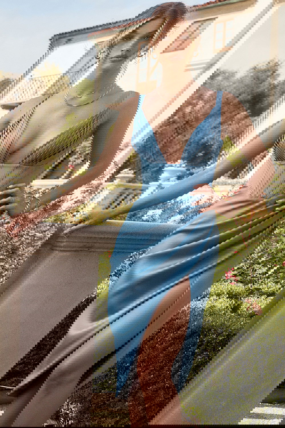 Son décolleté plongeant et son tissu somptueux en soie et satin épousent parfaitement vos courbes, tandis que sa jupe mi-longue à coupe irrégulière et son design sans manches offrent une allure à la fois audacieuse et raffinée.
