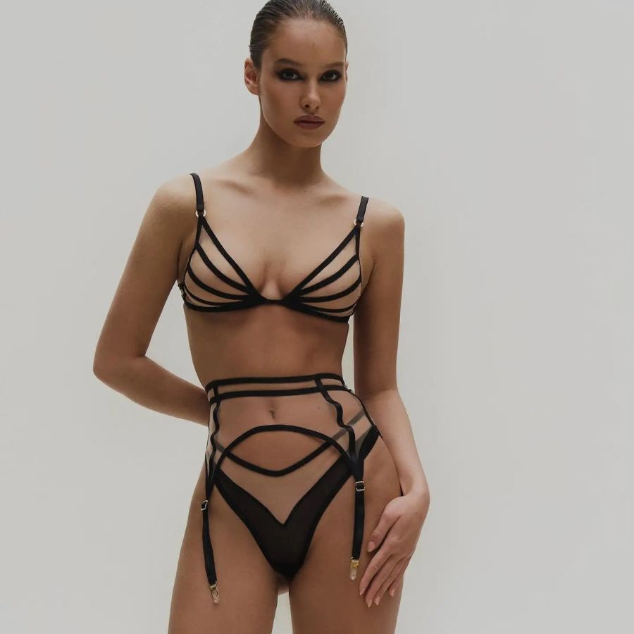 - Design Audacieux : Le mélange unique de bandes fines et de tulle transparent crée un visuel graphique et sensuel.