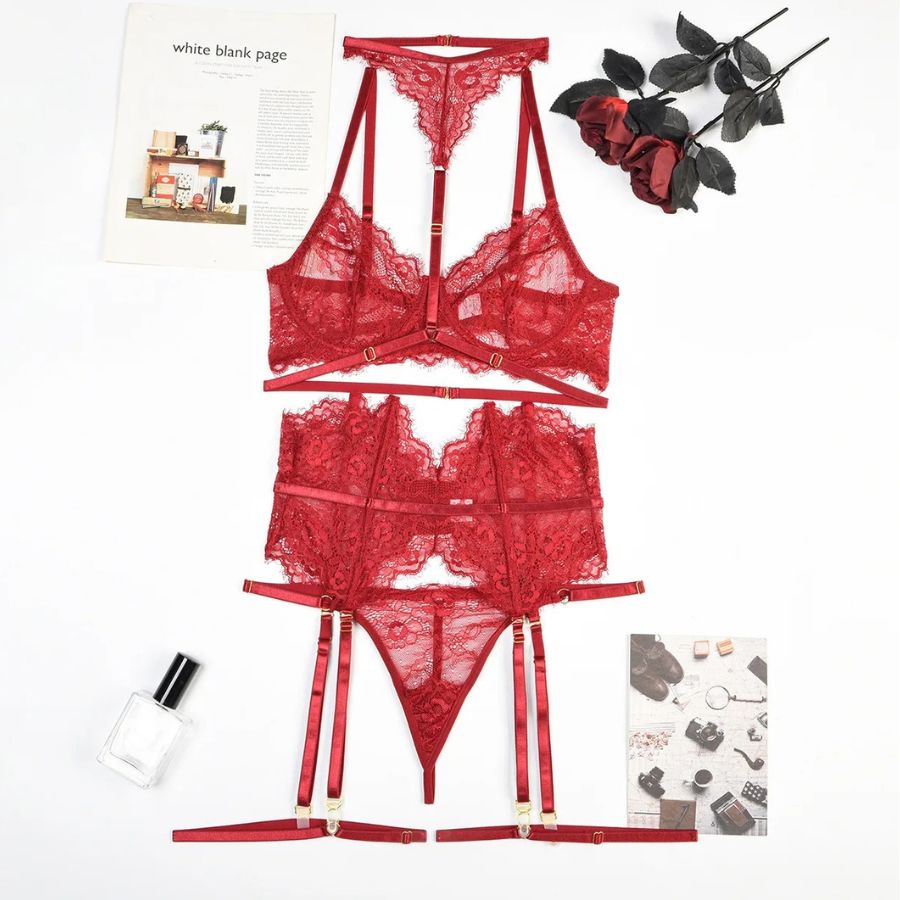 Faites une entrée remarquée avec l’ensemble LÉONORE, un mélange audacieux de chic et de sensualité. Cet ensemble en dentelle rouge met en valeur votre silhouette tout en offrant un confort optimal. Parfait pour celles qui souhaitent se sentir à la fois sexy et élégante.