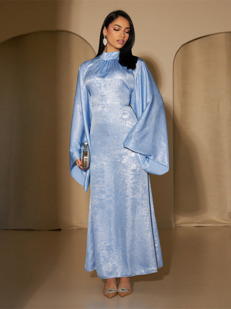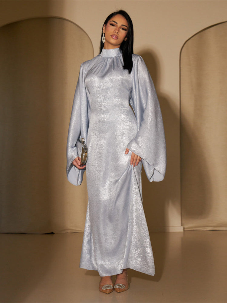 - Col Montant et Manches Évasées : Pour une allure majestueuse et sophistiquée.