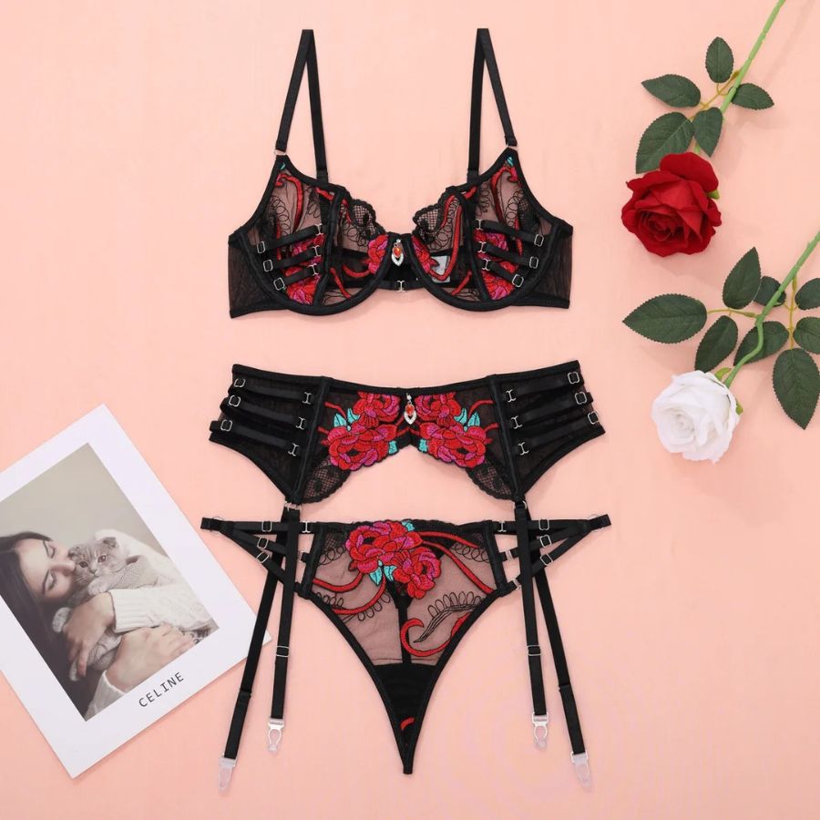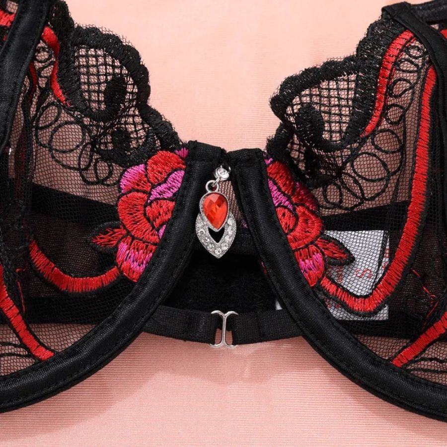Faites chavirer les cœurs avec cet ensemble porte-jarretelle en dentelle noir et rouge, au charme envoûtant. Le soutien-gorge à armatures dévoile un décolleté audacieux orné de broderies florales, tandis que le string en tulle transparent épouse les courbes avec sensualité. Le porte-jarretelle structuré sublime la silhouette et permet d’attacher élégamment des bas pour un look glamour assumé.